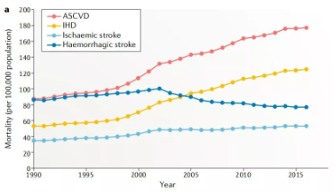 腦卒中、冠心病等心血管疾病(Cardiovascular disease,CVD)是造成我國居民死亡和疾病負(fù)擔(dān)的首要病因,占中國死亡人口的40%,CVD發(fā)病率呈現(xiàn)逐年快速攀升的趨勢,目前我國CVD患者超過 2.9 億例。動脈硬化性心血管疾病(Atherosclerotic cardiovascular disease,ASCVD)是一種單一類型的心血管疾病,包括缺血性卒中(Ischaemic stroke)和缺血性心臟?。↖schaemic heart disease,IHD)。從1990年至2016年,ASCVD的死亡人口增加近100萬,據(jù)統(tǒng)計(jì)2016年約有240萬人死于ASCVD,占CVD總死亡人口的61%,占所有死亡的25%。