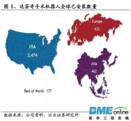 截至2017年6月,全球共有4149臺(tái)達(dá)芬奇,亞洲的數(shù)量占13%