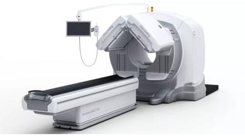 照片中的便是SPECT成像系統(tǒng),在患者診斷床的上方是SPECT成像系統(tǒng)的兩個探測器,它們重達(dá)660磅重,是可以沿著機架在患者上方旋轉(zhuǎn)的。