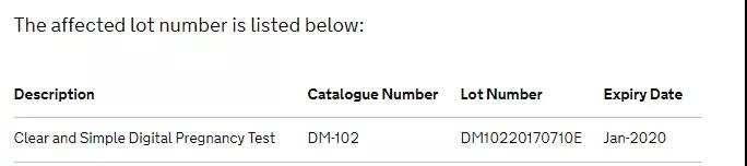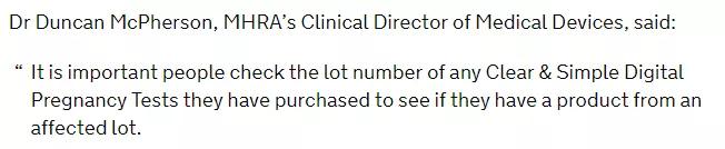 譯:MHRA醫(yī)療器械的臨床主任鄧肯·麥克弗森博士說(shuō):人們要重點(diǎn)檢查他們購(gòu)買的任何清晰和簡(jiǎn)單的數(shù)字妊娠測(cè)試的批號(hào),看看他們是否有來(lái)自受影響批號(hào)的產(chǎn)品。