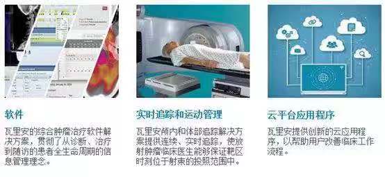 瓦里安提供的服務(wù)主要是其為放療系統(tǒng)開發(fā)的一系列輔助手段,包括綜合腫瘤治療軟件、放療實(shí)時(shí)追蹤和運(yùn)動(dòng)管理系統(tǒng)以及云平臺(tái)應(yīng)用。