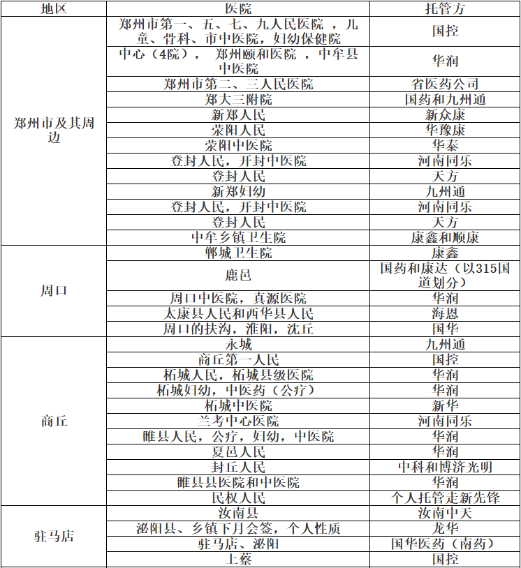 事實上,九州通、華潤醫(yī)藥、國藥等藥事巨頭近年來高歌猛進的藥房托管已經(jīng)為今天的耗材集采和托管服務(wù)埋下了深厚的伏筆——本質(zhì)是大規(guī)模并購后的醫(yī)藥物流服務(wù)延伸入院的頂層利益格局的滲透。下面是河南省在2015年的藥事(含部分耗材)供應(yīng)托管統(tǒng)計表,有興趣的同仁可以深度了解一下: