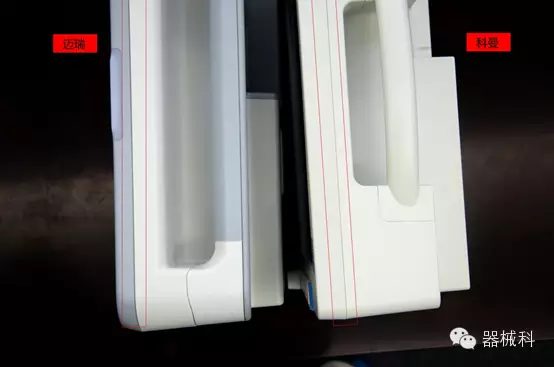 科曼與邁瑞因機(jī)身尺寸上有區(qū)別,所以手柄方面,科曼明顯比邁瑞要小??坡捎么蠡《?,呈現(xiàn)橢圓截面的設(shè)計(jì);邁瑞采用方形小圓角,折疊活動(dòng)式的提手,塑膠包裹。手柄嬌小,不利于握持,但重心集中,更穩(wěn)定;手柄碩大,活動(dòng)范圍廣,卻也容易晃動(dòng)。