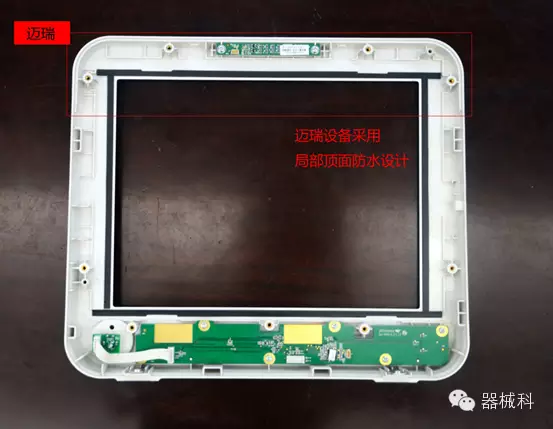 防水是所有電子類產(chǎn)品的一個(gè)重要功能。如果防水功能設(shè)計(jì)不好,儀器很容易受潮,從而引起使用不便,嚴(yán)重的將會(huì)報(bào)廢??坡昂髿ぶg采用硅膠密封線整圈的防水設(shè)計(jì),做工更麻煩,耗材多,但更安全;邁瑞前后殼之間采用硅膠密封線頂部的局部防水設(shè)計(jì),省時(shí)省料,但存在安全隱患。