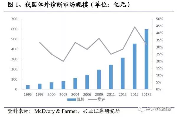 我國(guó)體外診斷行業(yè)相較于歐美市場(chǎng),起步較晚,但發(fā)展快速,2015年,我國(guó)IVD市場(chǎng)規(guī)模達(dá)450億,預(yù)計(jì)2017年市場(chǎng)容量有望擴(kuò)增至600億。