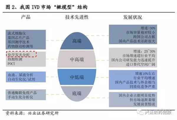產(chǎn)品結(jié)構(gòu)上,我國(guó)體外診斷行業(yè)總體呈現(xiàn)“橄欖型”結(jié)構(gòu):低端市場(chǎng)是前期廣泛使用的檢驗(yàn)技術(shù),發(fā)展空間小,增速緩慢,正在進(jìn)行方法學(xué)上的更新和迭代;中端市場(chǎng)由于近幾年國(guó)產(chǎn)研發(fā)能力迅速提升,渠道優(yōu)勢(shì)明顯,國(guó)內(nèi)產(chǎn)品正在處在高速發(fā)展階段;高端市場(chǎng)由于技術(shù)壁壘高,國(guó)內(nèi)外差異大,主要為國(guó)外產(chǎn)品,國(guó)內(nèi)產(chǎn)品目前在研發(fā)潛伏期,未來(lái)將迎來(lái)增長(zhǎng)。