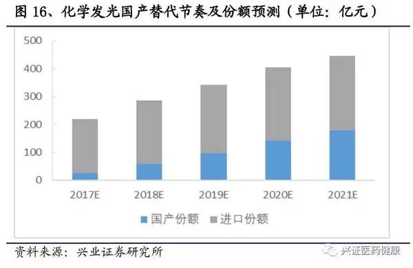 目前,化學(xué)發(fā)光行業(yè)以25%-30%的增速增長(zhǎng),現(xiàn)國(guó)內(nèi)企業(yè)已突破技術(shù)壁壘,進(jìn)入銷售放量階段,參考生化替代的節(jié)奏,5年內(nèi)可占有近一半的市場(chǎng)份額。預(yù)計(jì)在2021年,國(guó)內(nèi)廠家可總共占有百億以上的市場(chǎng)份額。