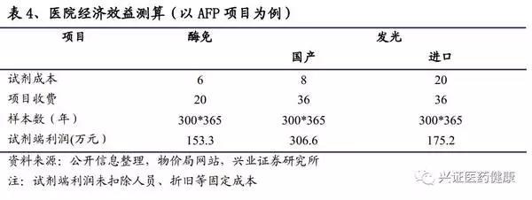 由于儀器是通過(guò)投放的形式進(jìn)駐醫(yī)院,從醫(yī)院端只需要計(jì)算試劑成本。以上測(cè)算可得出,此醫(yī)院若用發(fā)光替代酶免不僅進(jìn)行了檢驗(yàn)技術(shù)升級(jí),得到優(yōu)化的檢驗(yàn)結(jié)果,在經(jīng)濟(jì)效益上也更優(yōu)。在發(fā)光項(xiàng)目上,國(guó)產(chǎn)對(duì)比進(jìn)口經(jīng)濟(jì)效益明顯,單個(gè)項(xiàng)目可得到百來(lái)萬(wàn)的額外收益。