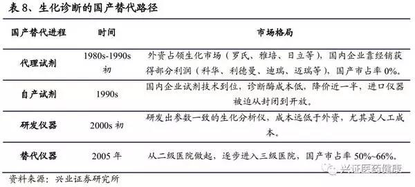現(xiàn)今,化學(xué)發(fā)光的發(fā)展階段與2000年左右的生化市場(chǎng)相似,回顧生化市場(chǎng)的國(guó)產(chǎn)替代進(jìn)程,可有一定的啟示作用。生化的發(fā)展首先從代理國(guó)外廠家的試劑開(kāi)始,逐步自主研發(fā)試劑,此時(shí)促使國(guó)外廠家對(duì)其生化系統(tǒng)進(jìn)行開(kāi)放。而后逐步研發(fā)出生化儀器,對(duì)整個(gè)生化診斷進(jìn)行替代。進(jìn)程如下:
