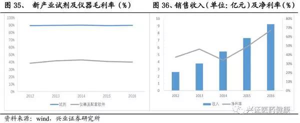 新產(chǎn)業(yè)2016年總收入9.23億元,絕大部分為發(fā)光產(chǎn)品,2012-2016年,新產(chǎn)業(yè)收入復(fù)合增速保持在37%左右。其中試劑增速較高,保持在35%以上,隨著儀器投放的增加,試劑的增速將會(huì)上升。由于近幾年空白市場(chǎng)將逐漸被消化,儀器的增速將呈現(xiàn)下降的態(tài)勢(shì)。