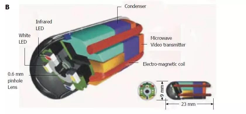 膠囊內(nèi)鏡的尺寸為9 mm×23 mm,0.6毫米彩色鏡頭和410000像素電荷耦合設(shè)備相機(jī)可以獲得高達(dá)每秒30幀(fps),只需患者穿著將微波傳輸?shù)侥z囊的背心。兩個(gè)罐與閥定位在中心和一個(gè)有用于存儲(chǔ)電力以及微波視頻信號(hào)發(fā)射機(jī)。在相機(jī)鏡頭周圍,放置了四個(gè)白色LED和用于調(diào)焦的磁線圈。更重要的是,40%的體積是自由空間,可用于手術(shù)目的,如藥物噴霧,激光治療,pH傳感等。雖然這種膠囊已經(jīng)在網(wǎng)上描述了十多年,至今仍沒(méi)有對(duì)這種膠囊進(jìn)行人體實(shí)驗(yàn)。