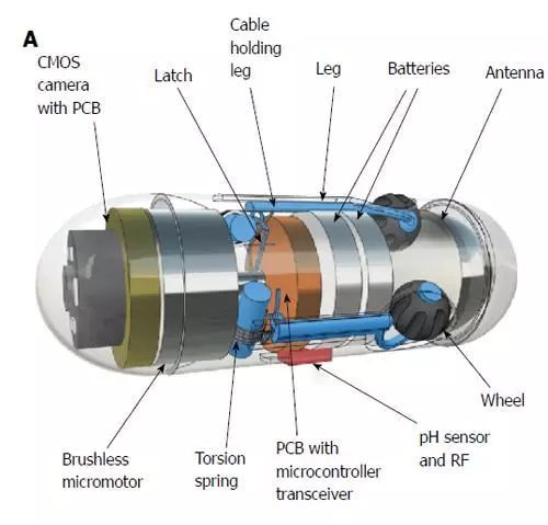 它配有3個(gè)微型腿,每個(gè)腿都帶有一個(gè)輪子。這些腿伸出和縮回得益于微電機(jī)和三個(gè)定做扭力彈簧。通過(guò)記錄它們執(zhí)行的每個(gè)旋轉(zhuǎn),車輪專門設(shè)計(jì)用作微型里程表。當(dāng)Odocapsule穿過(guò)小腸時(shí),輪子轉(zhuǎn)動(dòng)并且它們的旋轉(zhuǎn)被轉(zhuǎn)換到裝置覆蓋的距離,從十二指腸進(jìn)入點(diǎn)到每個(gè)感興趣的區(qū)域/點(diǎn)。