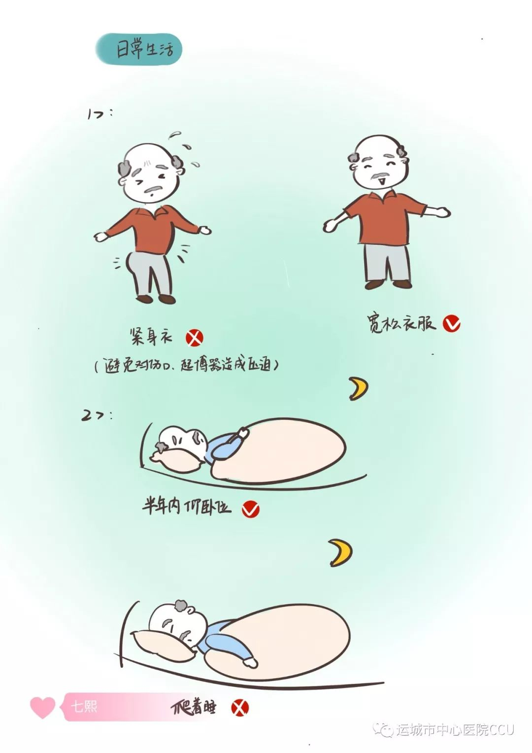 應(yīng)穿著寬松衣物、休息時(shí)保持仰臥位或側(cè)臥位,避免爬下睡對(duì)起搏器造成壓迫。