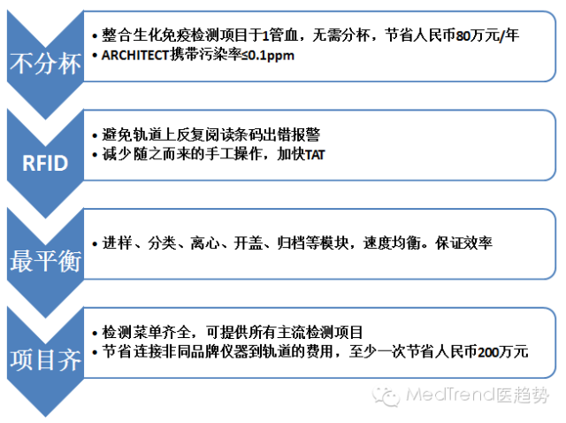 縱觀IVD國際品牌的發(fā)展歷程,都是從低速生化朝高速生化發(fā)展,由單機朝向集成化、自動化、流水線的方向發(fā)展。由于中國病人的過度集中于大型三級醫(yī)院,年收入超過10億的醫(yī)院每天樣本量超過1000個,高速儀器是高端醫(yī)院的剛需,因此研發(fā)高速儀器的能力也是未來進入大型公立醫(yī)院的前提要求,流水線、生化免疫聯機是大勢所趨。