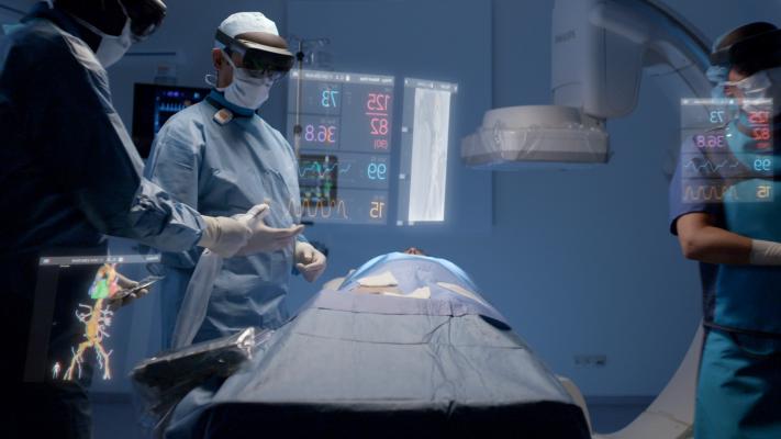 在微創(chuàng)手術(shù)過程中,醫(yī)生不能直接看到和觸摸治療區(qū)域,而是依靠先進(jìn)的醫(yī)學(xué)成像技術(shù),如超低劑量X射線成像和超聲波,以及其他導(dǎo)航技術(shù),觀察患者身體內(nèi)部并引導(dǎo)專用器械的行動(dòng)。飛利浦和微軟為HoloLens 2開發(fā)的增強(qiáng)現(xiàn)實(shí)概念(augmented reality concept),將目前顯示在大型2D屏幕上的重要數(shù)據(jù)的實(shí)時(shí)成像和其他來(lái)源,轉(zhuǎn)化為一種3D全息增強(qiáng)現(xiàn)實(shí)環(huán)境,這種環(huán)境可以被醫(yī)生以人體工程學(xué)的方式輕松直觀地控制。