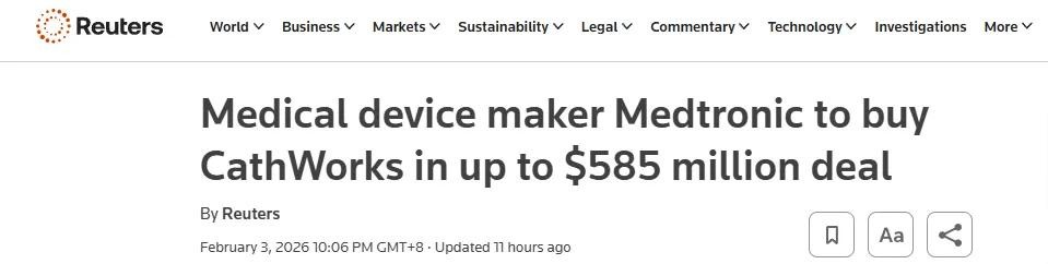 來(lái)源:器械之家,未經(jīng)授權(quán)不得轉(zhuǎn)載,且24小時(shí)后方可轉(zhuǎn)載近日,全球最大的醫(yī)療科技公司美敦力有限公司宣布,將行使選擇權(quán),以最高5.85億美元(約40億人民幣)收購(gòu)以色列心血管AI(人工智能)影像公司CathWorks,進(jìn)一步強(qiáng)化心血管產(chǎn)品組合。01開(kāi)年首次收購(gòu)此次收購(gòu)交易正等待美國(guó)聯(lián)邦貿(mào)易委員會(huì)(FTC